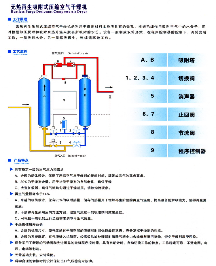 5) 吸附劑充填量極為充裕,大容量的干燥劑床保證了空氣與干燥劑有充足的接觸時間,使干燥劑能充分吸收水份,達到穩定的出口露點。保證出口空氣露點的穩定,除水效果。