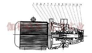 泵體4與電機法蘭連接,泵軸8裝在電機軸頭上是動配合,鍵2在鍵槽內可自由滑動。