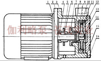 ??? 1W系列直連式單級旋渦泵采用泵與電機直聯結構,其進水口為水平方向,吐出口垂直向上。從泵端看,泵為逆時針轉動。葉輪可在懸臂軸上自由滑動,運轉時能自動調正葉輪二面的間隙,外隔板可借助于葉輪上的二螺孔與葉輪一起拆出。