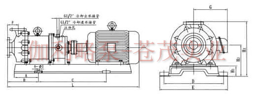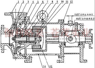 CQB-G型高溫磁力驅動泵(簡稱高溫磁力泵)通常由電機,磁力耦合器,水冷卻裝置和耐腐蝕離心泵四大部分組成,其主要特點是利用磁力耦合器傳遞動力。當電動機帶動磁力耦合器的外磁鋼旋轉時,磁力線穿過間隙和隔離套,作用于內磁鋼上,使泵轉子與電動機同步旋轉,無機械接觸地傳遞扭矩。在泵的動力輸入端,由于液體被封閉在靜止的隔離套內,沒有動密封因而無泄漏。磁力耦合器的磁性材料采用耐高溫型稀土永磁材料,能承受280度以下的高溫介質而保持強大的磁力扭矩。在電機與磁力耦合器之間加裝了水冷卻裝置,防止泵送高溫介質之熱量傳導至電機,以保持電機的正常運行,從而達到無泄漏輸送高溫介質。