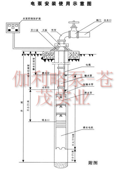 2.水泵進水口必須在動水位1米位以下,但潛水深度不得超過靜水位以下70米,電機下端距井底水深最少在1米以上。