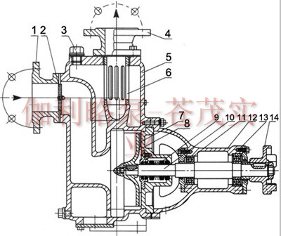 ???? ZW型無堵塞自吸排污泵為單級單吸臥式,吸入口為軸向吸入,排出口為垂直向上,自吸入口向電機端看為順時針方向旋轉。
